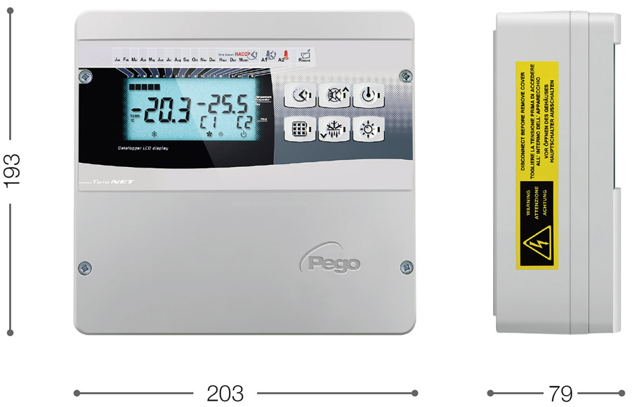 - Control of up to two compressors, double evaporator (fans and defrost elements) and room light.