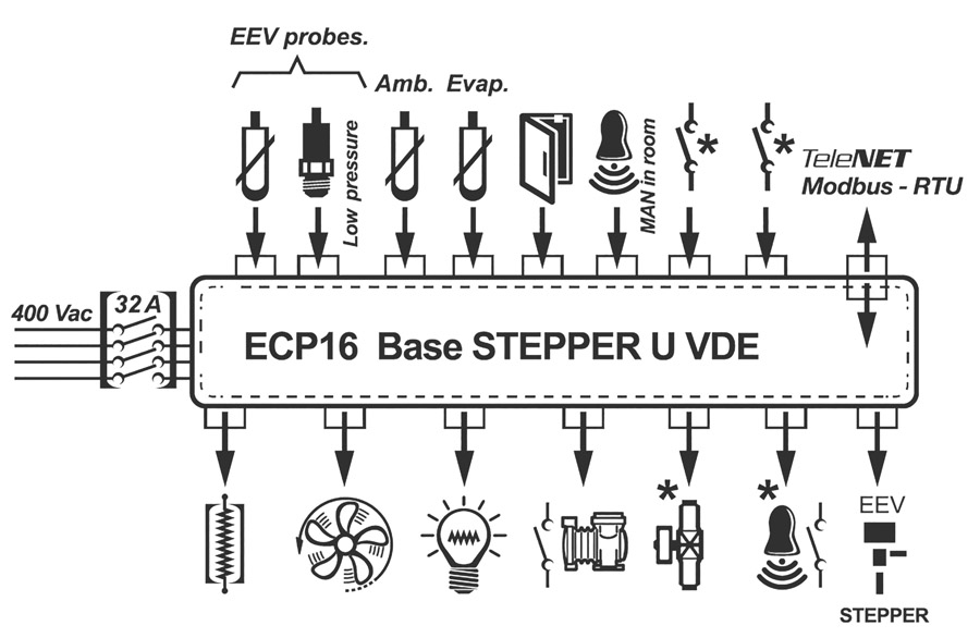 Linea di quadri di potenza con controllo della valvola di espansione elettronica (motore passo-passo) dedicati alla gestione della sola unità evaporante trifase dove le utenze sono abbinate ad una centrale frigorifera o unità motocondensante remota.