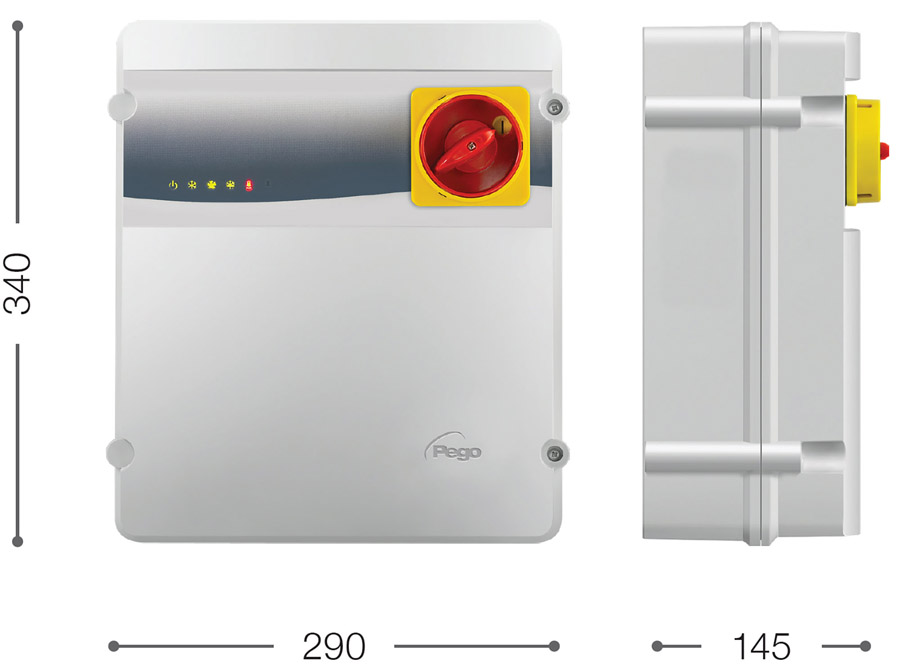 - Quadro compatto in ABS autoestinguente con grado di protezione IP65 e sezionatore a frontequadro.